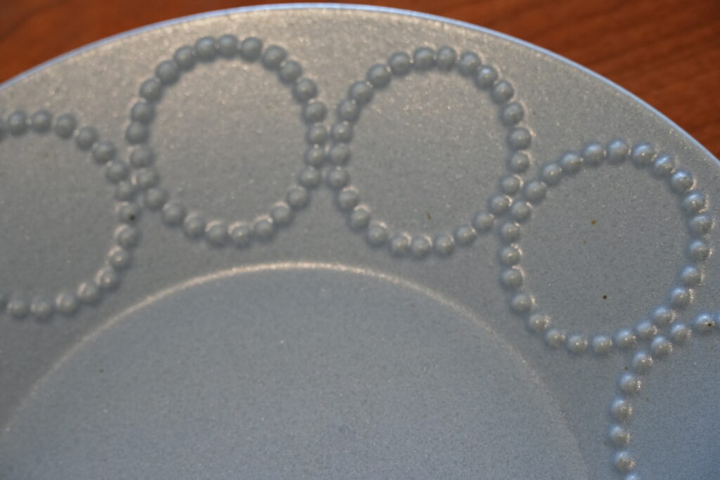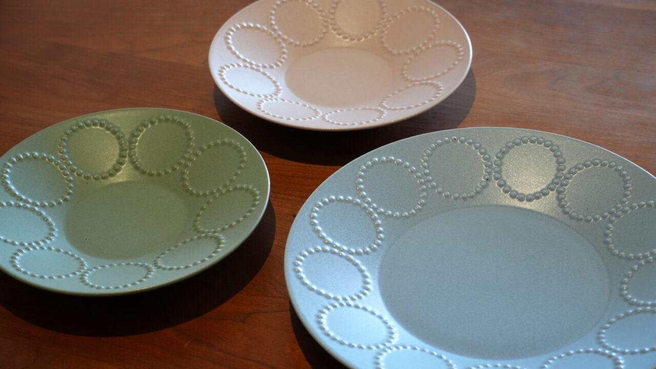 和食器でもあり、手作業で釉薬がつけられていることから、少し表面に色の違いや焼きの違いが表れていたり、ドットのレリーフの凹凸が少しずつ違ったりと、手作りの温かみを感じることができます。